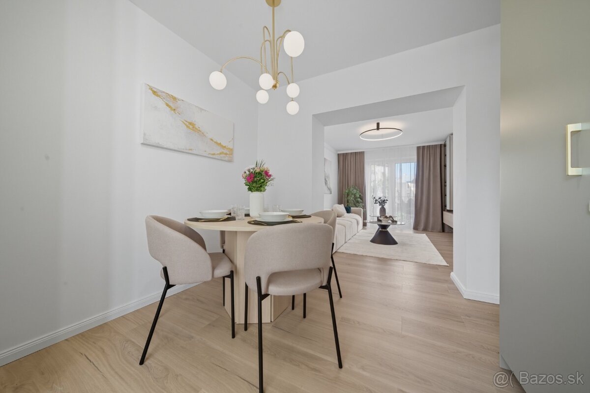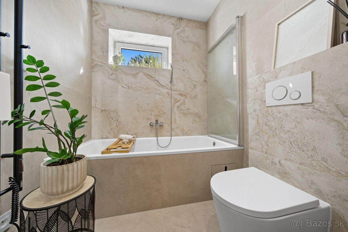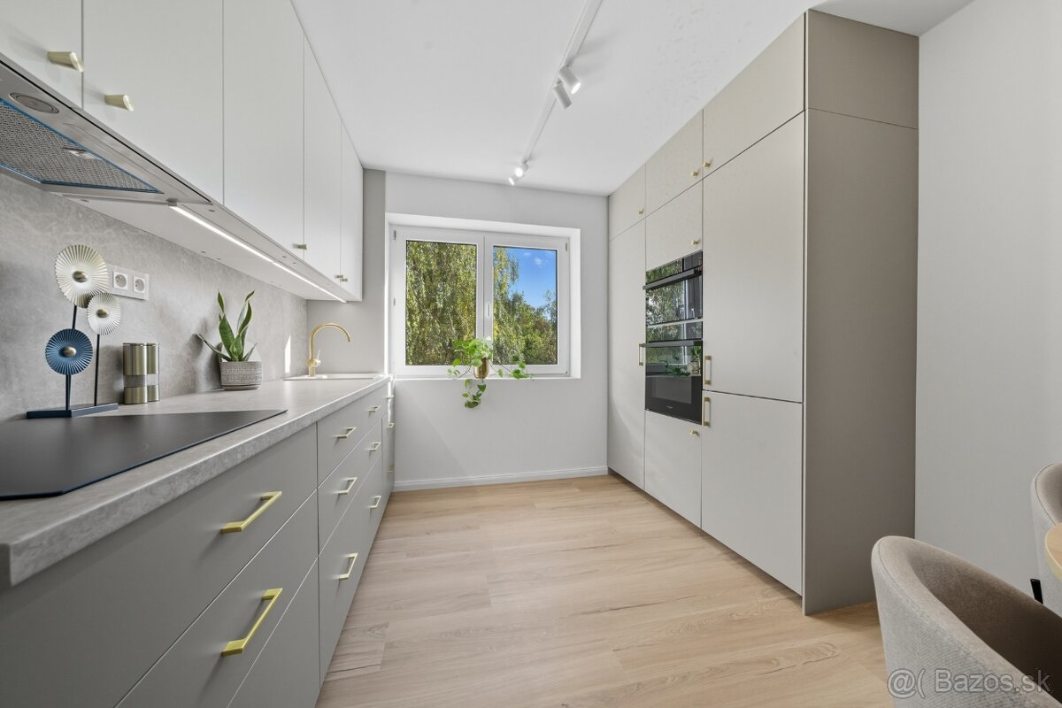 Moderný, nadčasový a premyslený dizajn v neutrálnych tónoch s elegantnými čiernymi akcentmi. Nové rozvody, elektrické podlahové kúrenie rozdelené na 4 samostatné zóny, vlastný elektrický bojler na ohrev teplej vody, minerálna kompozitná podlaha, vaňa so zástenou, WC, dvoj umývadlo, LED podsvietené zrkadlá, kuchynská linka so spotrebičmi (umývačka riadu, vstavaná rúra, vstavaná mikrovlnka a vstavaná chladnička). Video vrátnik v byte, dotykové vypínače. Predpríprava na klimatizáciu. Sadrové omietky, SDK stropy, 9 bodové bezpečnostné dvere. Stačí sa len nasťahovať.