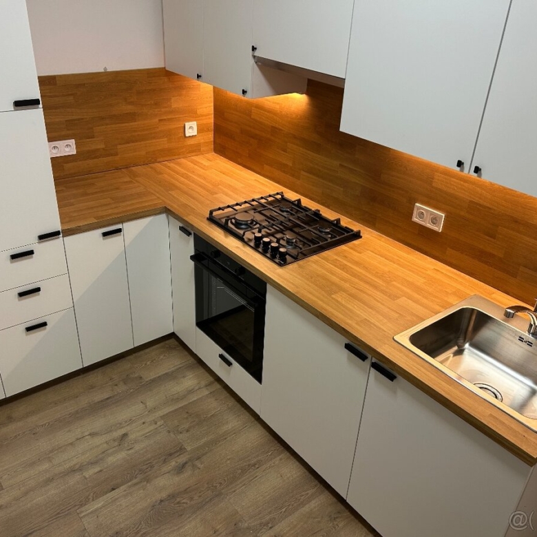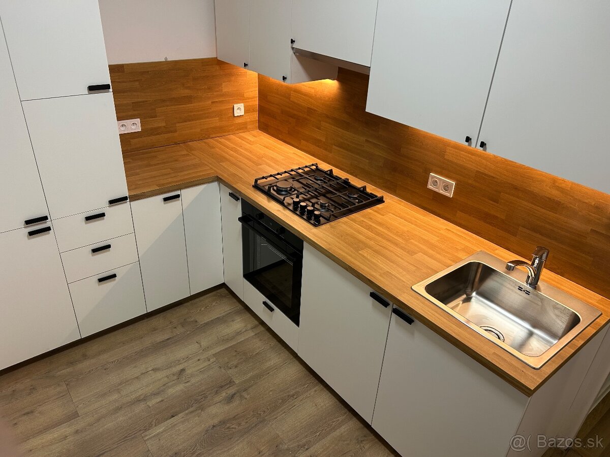 Zariadenie : plynová varná doska, digestor, rúra, chladnička s mrazničkou, práčka zabudovaná v kuchynskej linke ( viac miesta v kúpeľni )