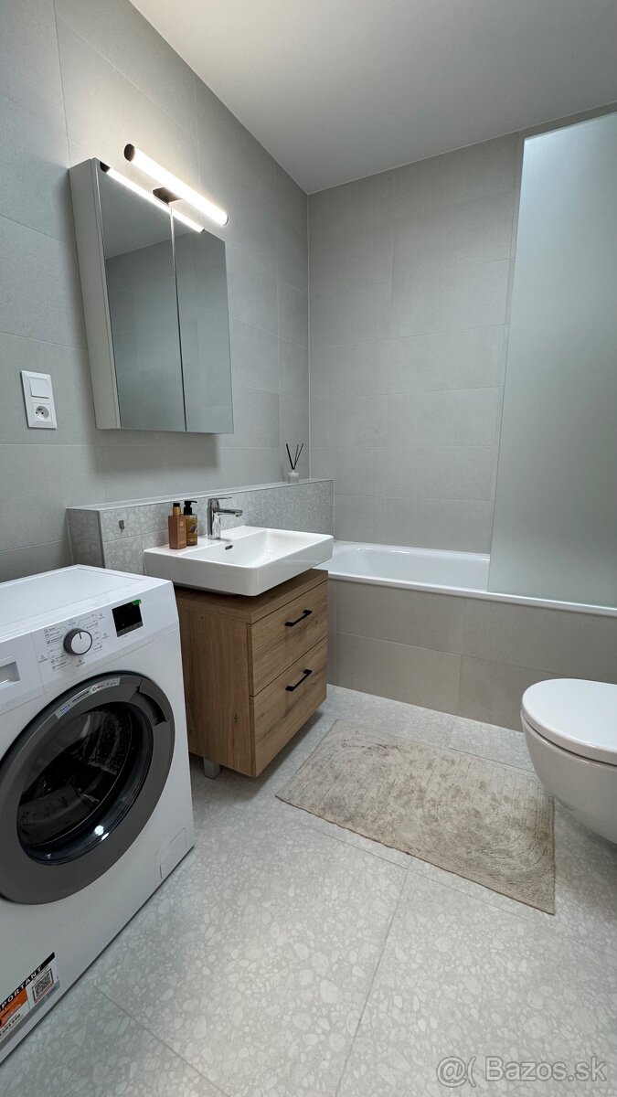 V kúpeľni je vaňa, WC, umývadlo, práčka a úložné skrinky so zrkadlom.