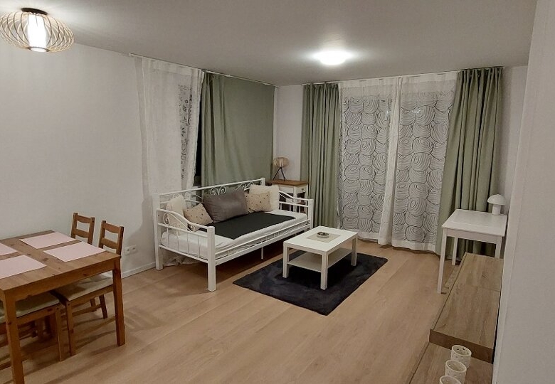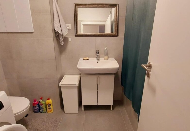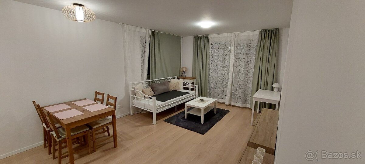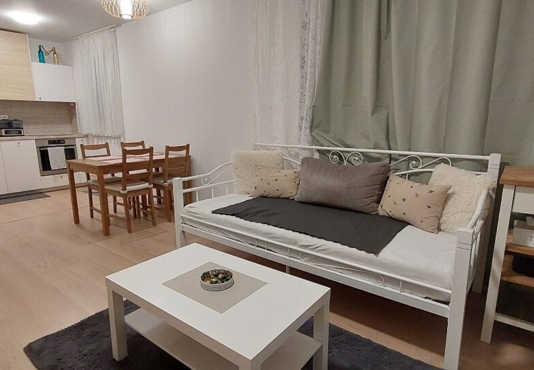 Zateplený bytový dom má železobetónový skelet s tehlovými priečkami. Byt pozostáva zo vstupnej chodby so šatníkovou skriňou, obývacej izby spojenej s kuchyňou, spálne a kúpeľne s WC. Štandardom sú sanita Hansgrohe, WC Geberit, 6 komorové okenné rámy, trojsklo. V byte je nainštalovaný audio vrátnik a nová kuchynská linka so zabudovanými spotrebičmi – indukčná varná doska, elektrická rúra, chladnička s mrazničkou, umývačka riadu, jedálenský stôl a 4 stoličky. Dvojposteľ v spálni a pohovka / single bed v obývačke, veľa úložného priestoru v skriniach. Budeš potrebovať vlastný vysávač, príbor a riad. Byt má bezpečnostné dvere a nekopírovateľný kľúč.