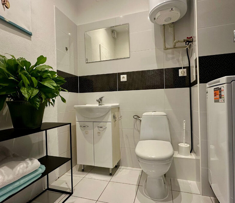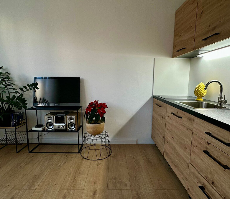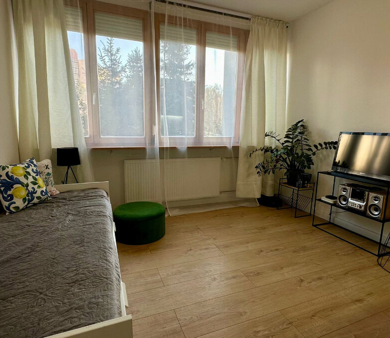Garsónka je aktuálne zrekonštruovaná s veľkými drevenými oknami, ktorá je komplet zariadená – indukčná doska, Tefal optigrill, chladnička, práčka, mikrovlnka. V byte sa nachádza televízor, rádio, robotický vysávač, masážna sprcha a rozťahovacia posteľ, stôl so stoličkami.