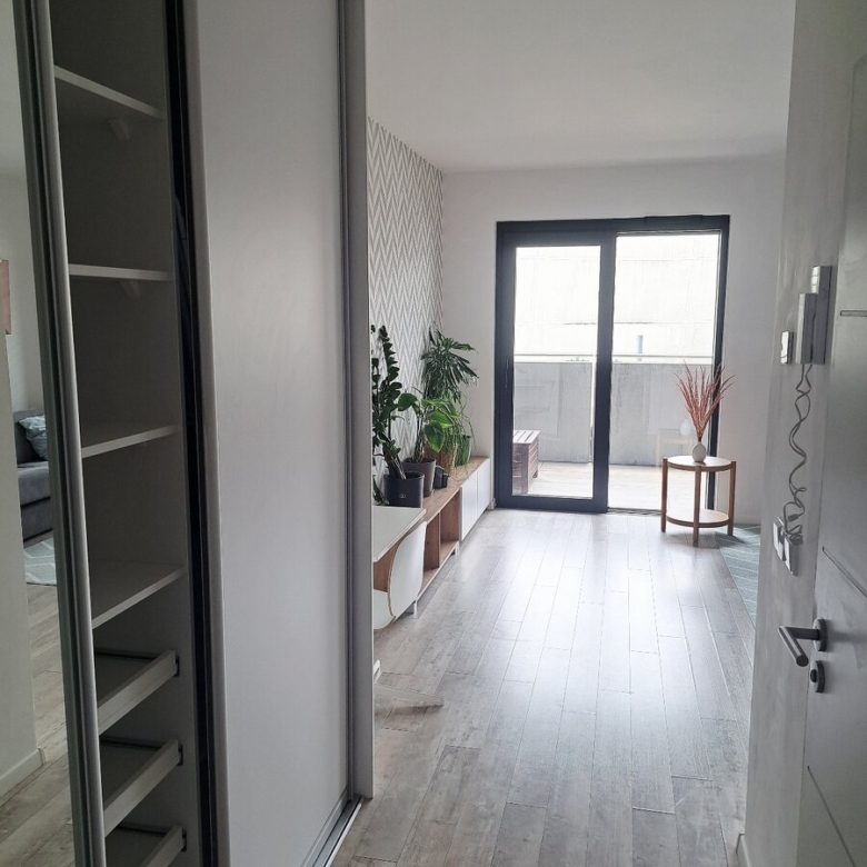 Byt sa nachádza sa na 3. poschodí. Hneď pri vstupe zaujme praktickým pôdorysom, presvetleným a praktickým prepojením interéru s exteriérom cez veľkoformátové okná. Po ľavej strane sa nachádza priestranný vstavaný roldor s dostatkom úložného priestoru. Chodbou sa prechádza do hlavnej miestnosti s kancelárskym kútom a zelenou kvetinovou časťou. Obývačke dominuje sedačka s možnosťou rozloženia na posteľ (dostatok priestoru aj na samostatnú posteľ), barový pult oddeľuje kuchynský kút v nadčasovej bielej farbe s modernými spotrebičmi (indukcia, rúra, chladnička, mikrovlna). Kúpeľňa pôsobí elegantne vďaka sivo-bielej kombinácii a okrem štandardu ponúka vaňu i práčku.