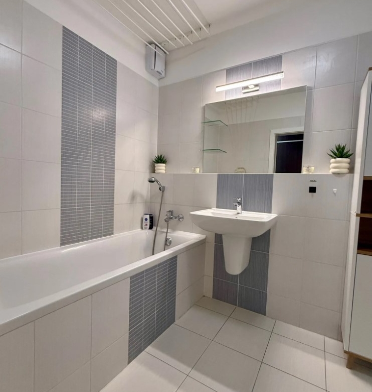 Byt je kompletne zariadený nábytkom, k dispozícii je automatická práčka, dve vstavané šatníkové skrine s dostatkom úložného priestoru a plne vybavená kuchyňa vrátane umývačky riadu. Byt má klimatizáciu a je pripojený na optický internet a TV.