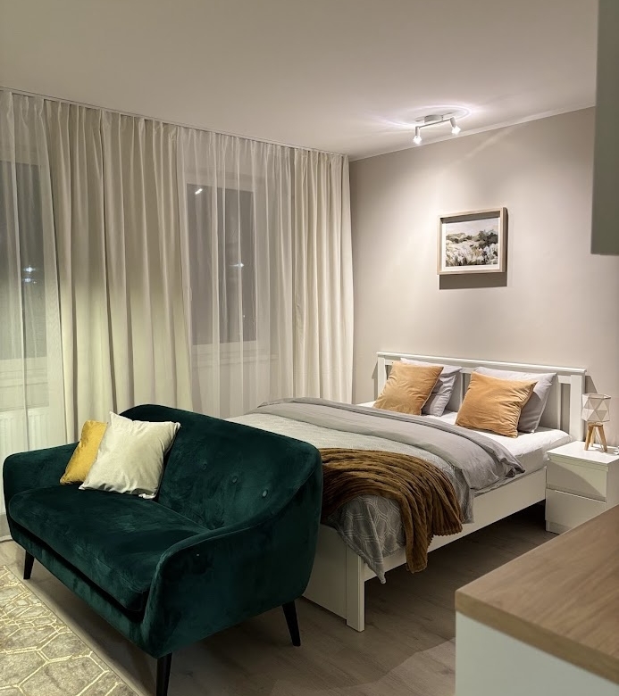 – izba, ktorá obsahuje: útulná a moderná sedačka, nábytok s TV a konferenčným stolíkom, jedálenský stôl s 2 stoličkami, manželská posteľ a kuchynská linka so spotrebičmi (vstavaná rúra, indukčná doska, chladnička, mikrovlnka)