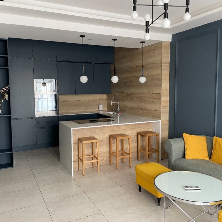 kuchyňa: rúra, mikrovlnka, umývačka riadu, indukčná varná doska s integrovaným odvetrávaním, vstavaná chladnička s mrazničkou, výsuvný odpadkový kôš
