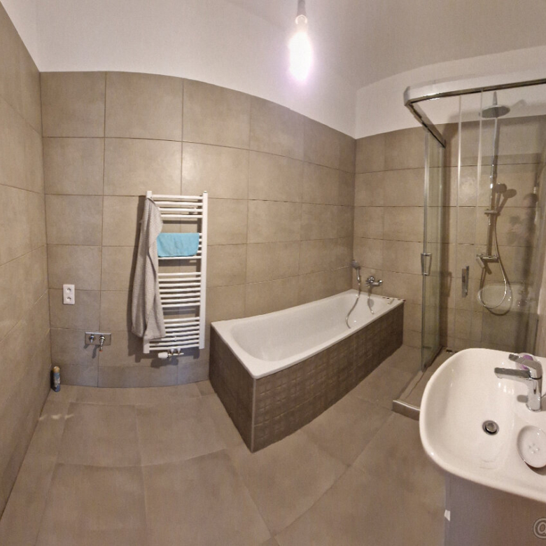 • kúpeľňa so sprchovým kútom, vaňou, veľkým umývadlom, skrinky na mieru a prípravou na práčku