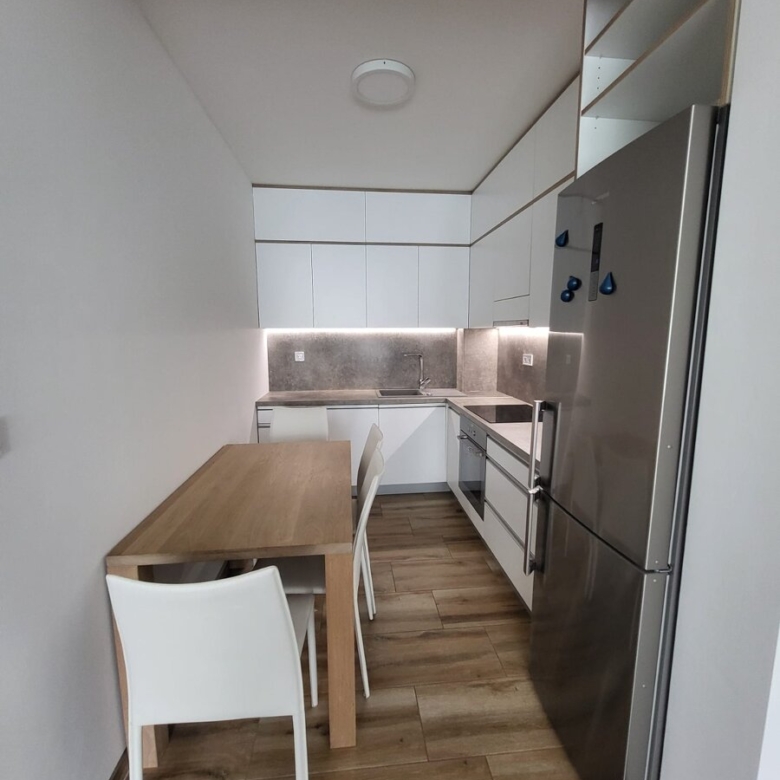 Kuchynská linka je tiež vyrobená na mieru s drezom, zabudovanou indukčnou varnou doskou, elektrickou rúrou, umývačkou riadu a chladničkou s mrazničkou. V kuchynskej časti je aj jedálenský stôl a 4 stoličky.