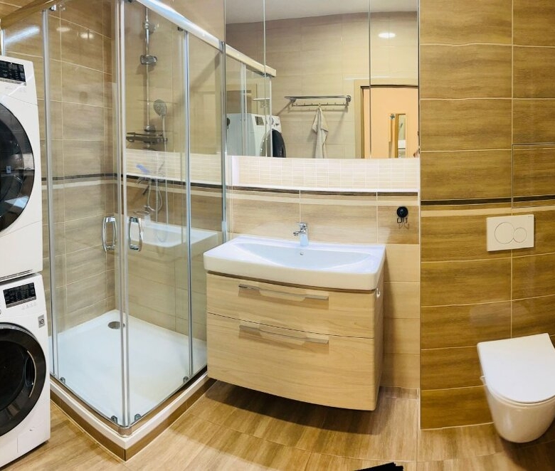 Byt pozostáva z veľkej vstupnej haly, kde je vstavaný nábytok na mieru aj s pracovným stolom. Kúpeľňa je vybavená sprchovým kútom, umývadlom, toaletou, kde je k dispozícii práčka aj sušička a dostatok priestoru poskytuje nábytok na mieru s veľkým zrkadlom so skrinkou. Obývačka je zariadená nábytkom na mieru a rohovou sedačkou. Z obývačky je vstup do samostatnej spálne, kde je manželská posteľ s kvalitným matracom a veľký rolldoor.