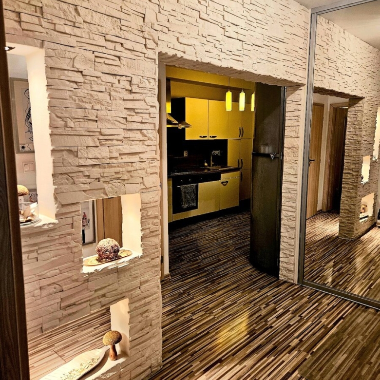 Byt sa skladá z priestrannej vstupnej chodby s premyslene riešeným úložným priestorom, ktorá rozdeľuje byt na jednotlivé časti. Po pravej strane chodby sa nachádza menšia spálňa prístupná cez zabudovaný šatník. Na chodbe je umiestnené samostatné WC a kúpeľňa vybavená vaňou a umývadlom a kúpeľňovým nábytkom na mieru. Súčasťou bytu je aj kuchyňa s praktickým barovým sedením a uzavretou loggiou. Po ľavej strane z hlavnej chodby nájdete obývaciu izbu s krásnym výhľadom a samostatnú detskú izbu. Celkové usporiadanie bytu zabezpečuje komfortné bývanie pre rodinu s optimálnym využitím priestoru.