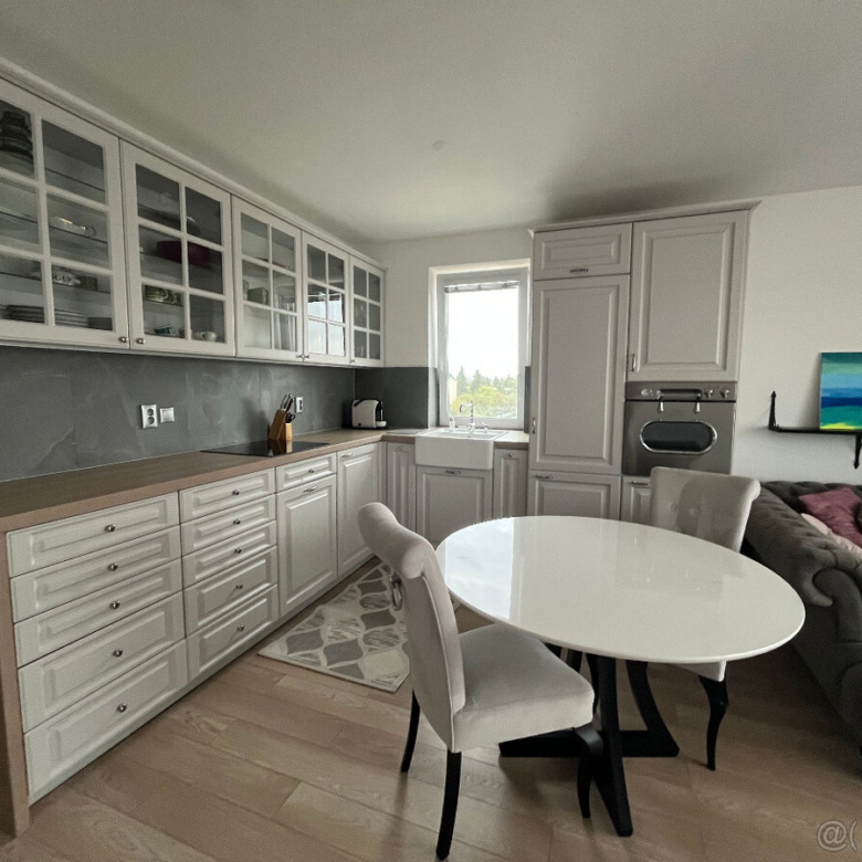 Byt je kompletne zariadený:veľký vstavaný šatník,skriňa, nočné stolíky, TV skrinka, police, veľký stôl so stoličkami,gauč, veľký sprchový kút,vstavaná umývačka riadu 60 cm, práčka, vysávač, žehlička s doskou, chladnička s mrazničkou, kávovar, internet,TV pripojenie 4ka, žalúzie, sieťky na oknách, sušiak, veľká posteľ
