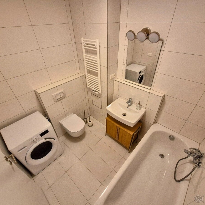 Elegantná kúpeľňa s pohodlnou vaňou, umývadlom, toaletou a práčkou.