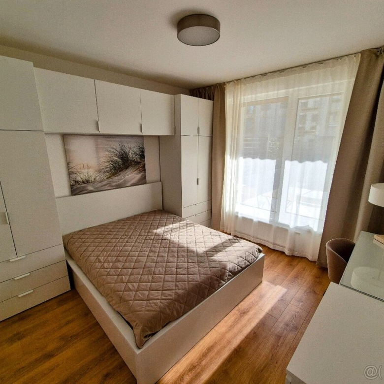 Tichá miestnosť s manželskou posteľou a veľkorysým úložným priestorom v vstavaných skriniach.