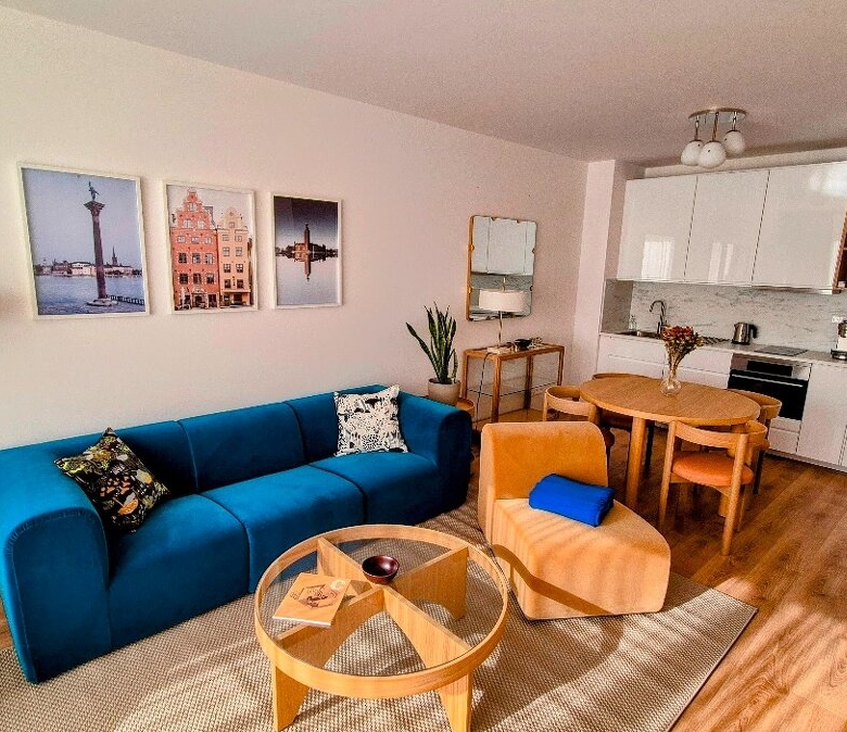 Moderná linka so všetkými vstavanými spotrebičmi (indukčná doska, rúra s mikrovlnkou chladnička, mraznička), novou výbavou kuchyne a jedálenský stôl.