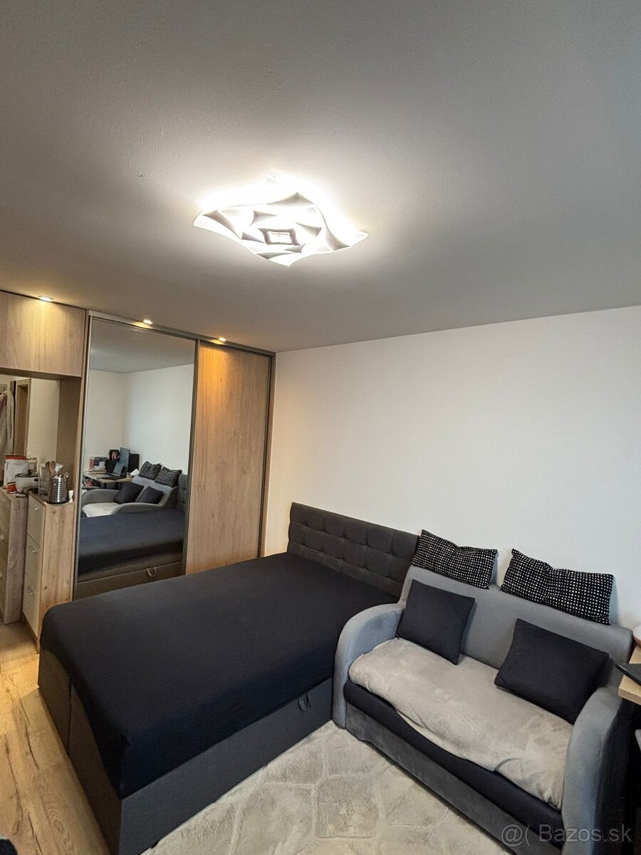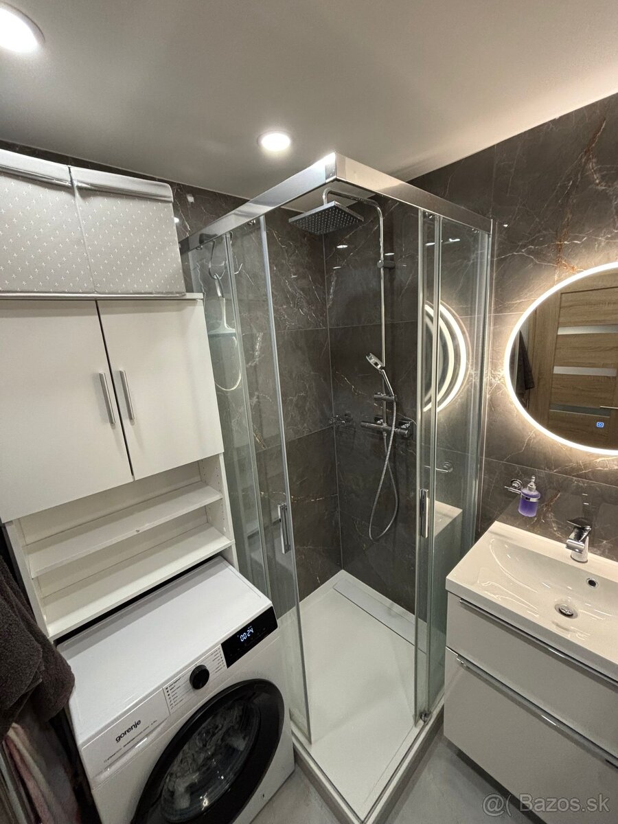 Vybavenie bytu: plastové okná, podlahy – parkety a dlažba, nové interiérové a vchodové dvere, strop SDK, kompletne vymaľovaný, vstavaná kuchynská linka na mieru so spotrebičmi (chladnička s mrazničkou, mikrovlnka, pec s grilom a indukčná doska), kúpeľňa so sprchovým kútom a integrovaným WC, zasklená loggia so stropným sušiakom (možnosť využitia v každom ročnom období), vstavaná skriňa so zrkadlom, klimatizácia, obývacia stena, písací stolík a kancelárske kreslo, rozkladací gauč, dvojpostel s úložným priestorom, vešiak (možnosť vybrať si namiesto toho stôl z masívneho dreva), v kúpeľni skrinka a práčka.