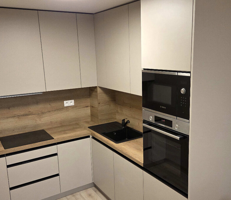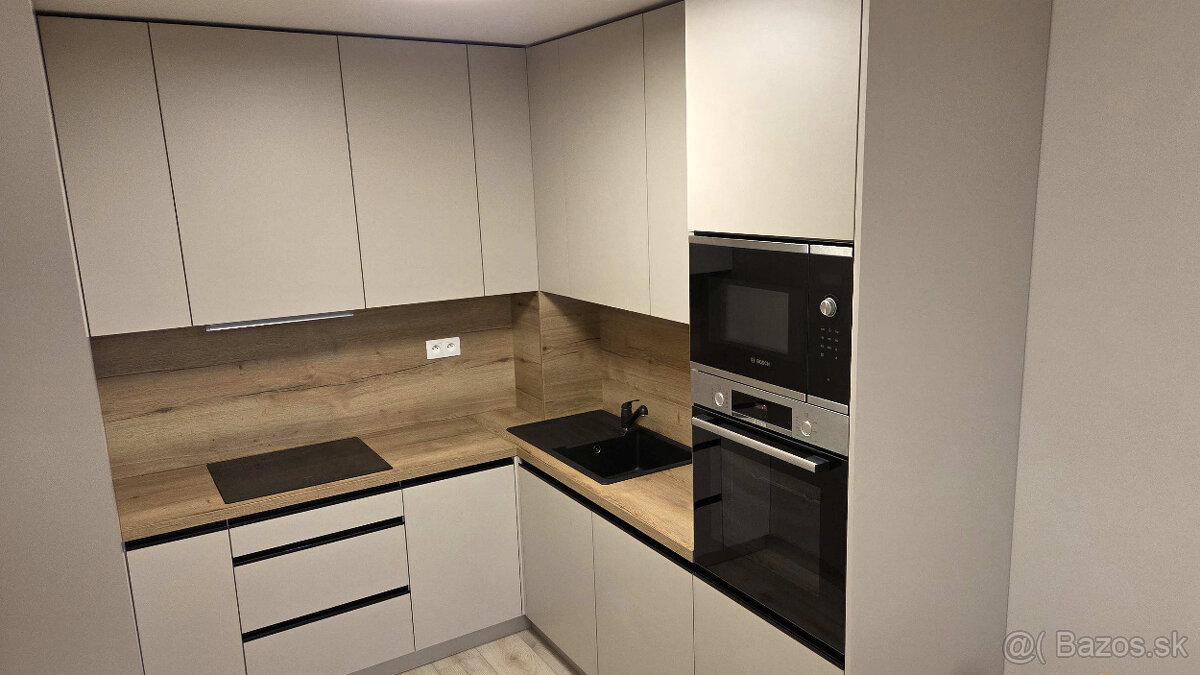 • Na mieru vyrobená kuchyňa s kvalitnými zabudovanými spotrebičmi zn. Bosch, Samsung, AEG (indukčná varná doska, umývačka riadu, chladnička s mrazničkou, mikrovlnka, rúra), práčka
